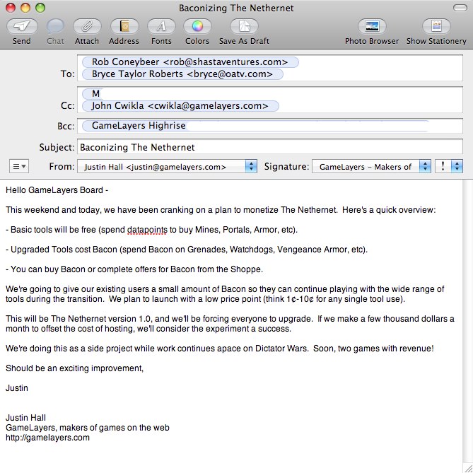 I confess I didn't really play the Nethernet after I laid everyone off at the end of GameLayers. I actually switched browsers - I needed to clear my head and now the game only works in Firefox 3. Rebuilding it for Chrome / IE / Safari is a challenge; maybe we could somehow port it to a floating HTML5 pallette or some other web hackery. I considered a kickstarter-type crowdfunding campaign to keep evolving this thing. But then I'd have to start beating the drum for this failed kind of gameplay, at best buying it another few months of life before it needs to find funds to stay online again.